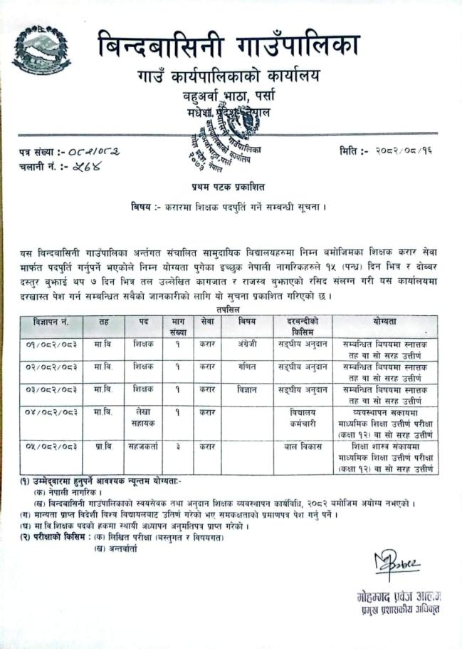 करारमा शिक्षक पदपुर्ति गर्ने सम्बन्धी सूचना ।