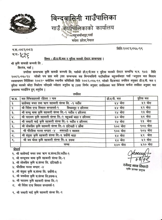 डि.ए.पी.मल र युरिया मलको रोष्टर सम्बन्धमा।