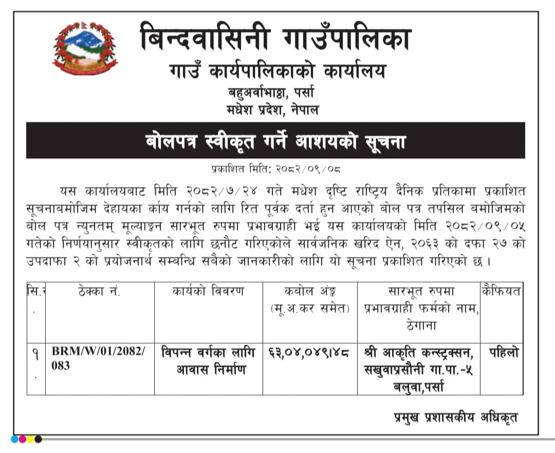 बाेलपत्र स्वीकृत गर्ने आशयकाे सूचना ।