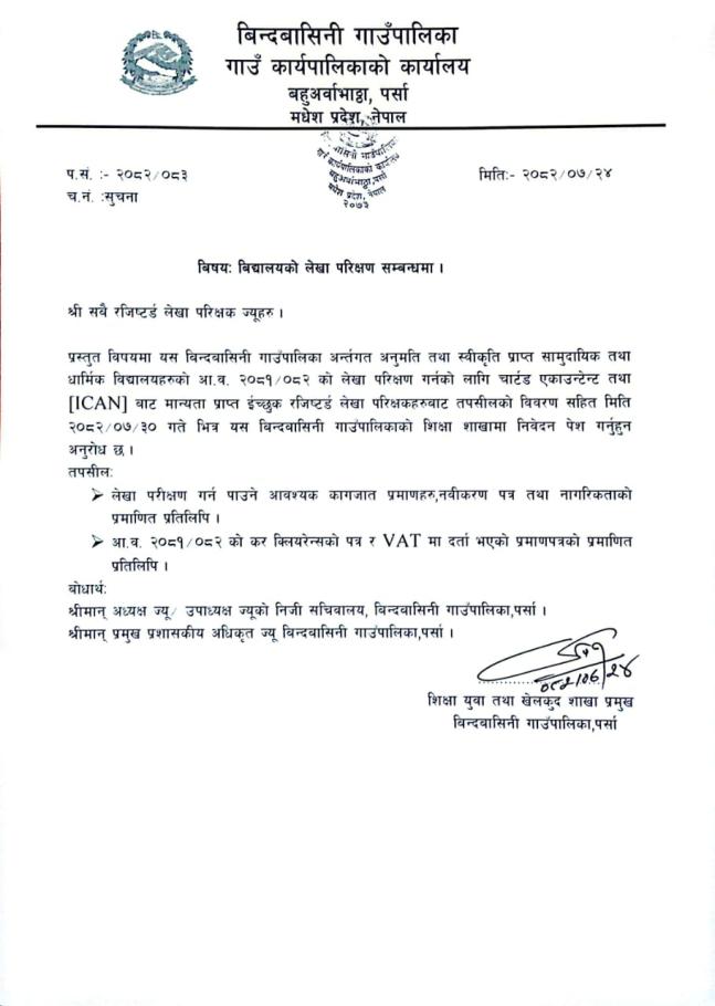 बिधालयकाे लेखा परिक्षण सम्बन्धमा ।